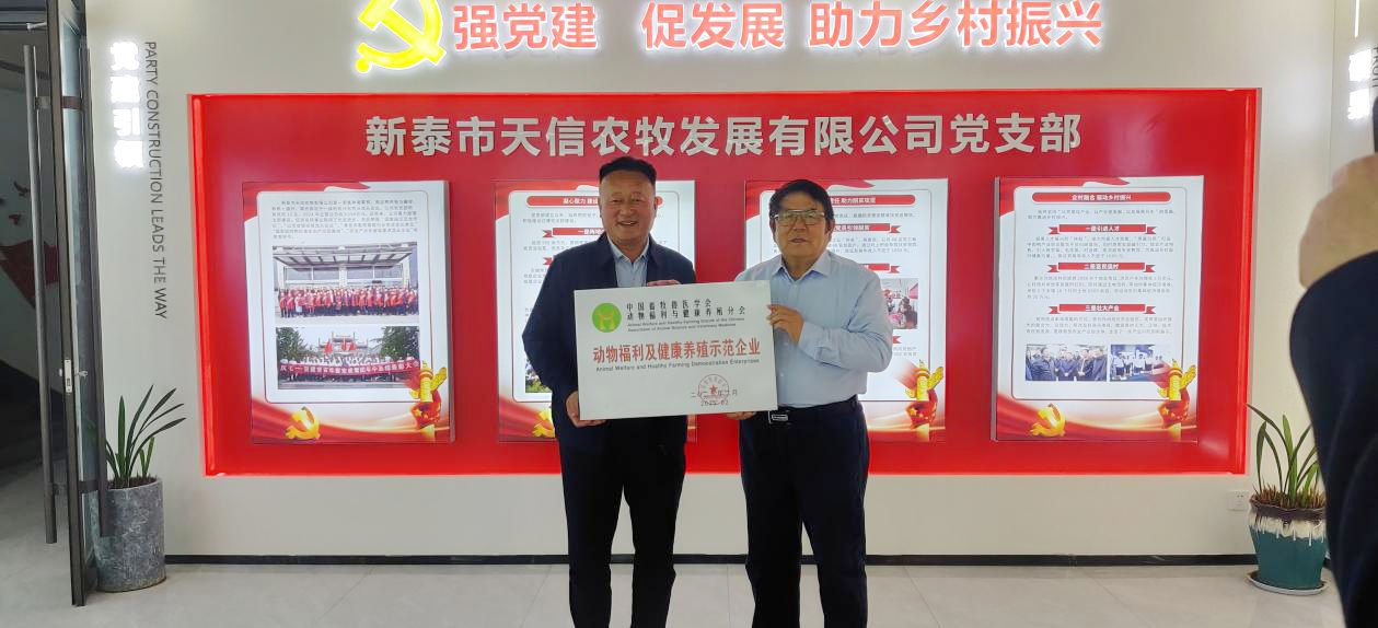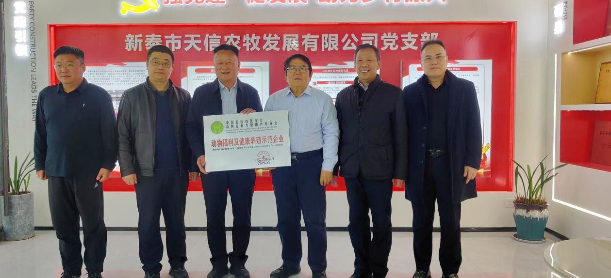 近日,中国畜牧兽医学会动物福利与健康养殖分会理事长刘建柱教授、名誉理事长柴同杰教授、名誉副理事长常维山教授、副秘书长戴培强所长等专家一行,应新泰市天信农牧发展有限公司邀请,赴企业开展专题调研,并为其颁发“动物福利与健康养殖示范企业”荣誉牌匾。